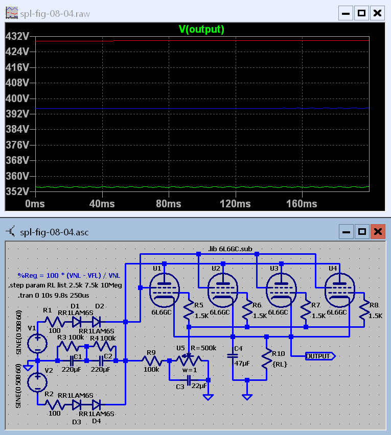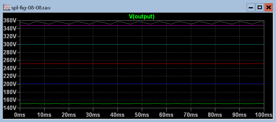 You may already be thinking that I am cheating because I have used 6L6GCs instead of the triode shown in figure 8.7. I say in my defense that the 6L6 tubes are triode connected. The amplification factor, μ, of a triode connected 6L6 is 8. (μ = Gm Rp where Gm = transconductance and Rp = plate resistance). That puts it down there with most of those heavy duty triode pass tubes.Two things are on the simulation diagram that are not on figure 8.7. They are C3 and C4. C3 was added to increase the loop gain for 120 Hz and above, which will reduce the ripple. The higher the loop gain the less ripple there is in the output. C4 is to keep the output impedance of the regulator low at medium and high audio frequencies. But as figure 8.8.2 shows they introduce a problem. The green trace is for a C4 value of 0.047 μF which is barely different from no capacitor at all. When the load current increases in a sudden step the voltage does really drop before being corrected as I described above. As it recovers it overshoots a little in the opposite direction before settling down to track the change in rectifier output but with considerably reduced amplitude. You don't have to take my word for it. Just add a trace for the voltage at the plate and screens of the 6L6s to the graph. I'll leave this one to you.