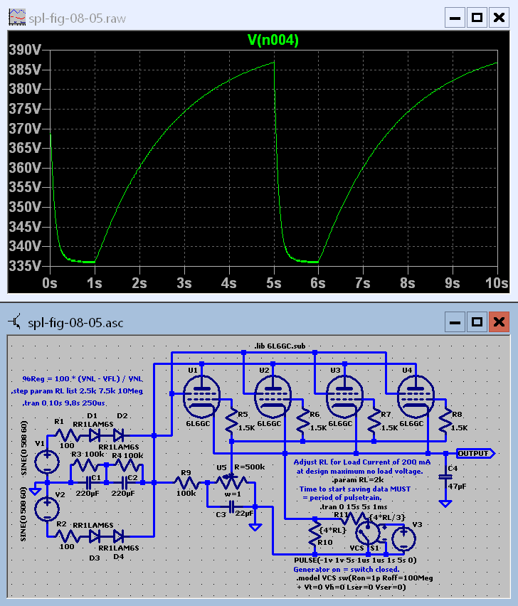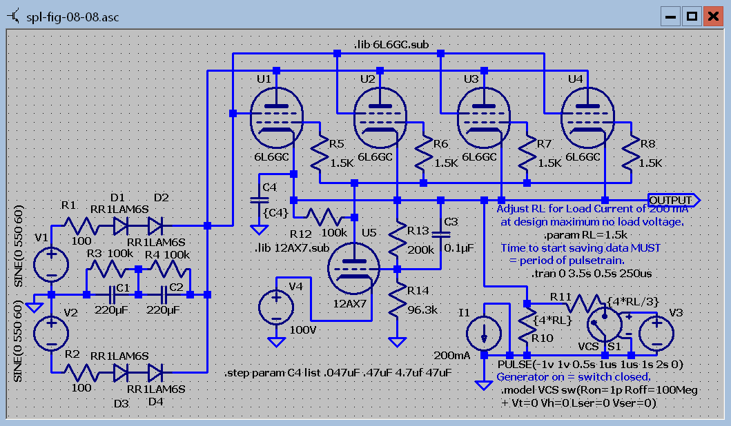 Ctrl tab back to spl-fig-08-80 and close it with ctrl F4. If you are asked to save it click no. Connect the upper input line of the dynamic test load to the cathodes of the 6L6GCs.