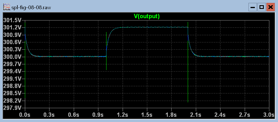 Figure 8.8.3.1 Simulation showing power supply with load that switches between 1/3 load and full load.
