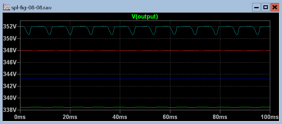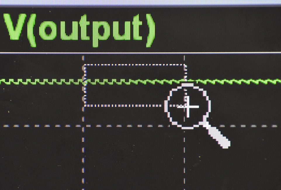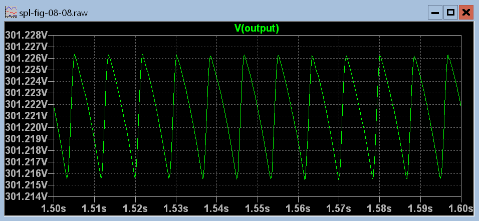 It is clear in the above figure that there is more ripple when the power supply is heavily loaded than when it is not so heavily loaded. But how much ripple is there? You don't have to change the time scale in the .tran directive and run the simulation again. The data is already there with 250 microsecond resolution. All you need to do is tell spice that you want to see it. . You can do that by first zooming in on a small part of the graph with the zoom to rectangle command.