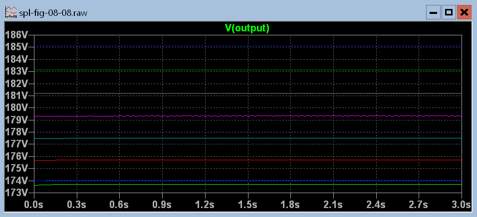 Figure 8.8.6 Output voltage for 5 different values of R13 covering most of the range of adjustment.