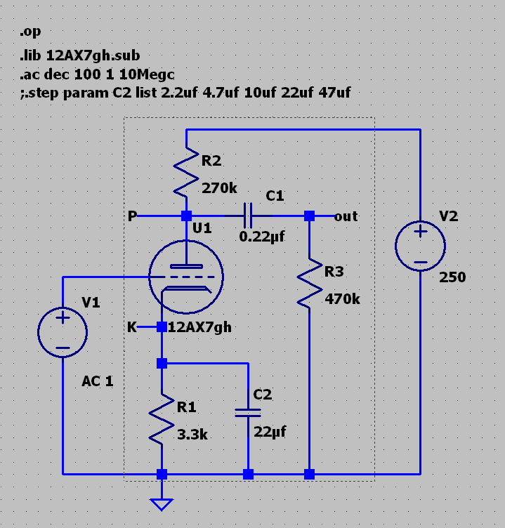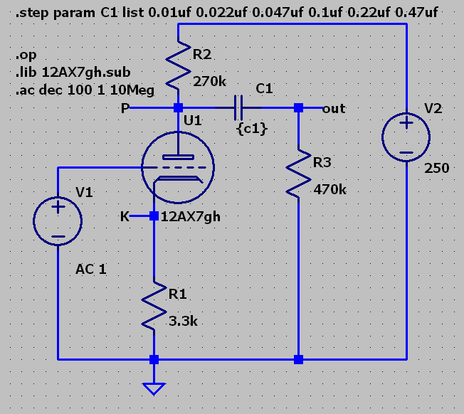Checking the operating point isn't hard, just edit the ".ac" directive and type a semicolon in front of it. Then run the simulation. The results will be in a popup box as before. They all are pretty good but the plate voltage of the 12BH7 might be a little on the low side. I'm not going to tell you what it is. You will have to run it yourself to find out. The same goes for the AC results.Wish I had chosen another tube or tubes? You've got the models. You don't need my permission to run them. That's what LTspice is all about.