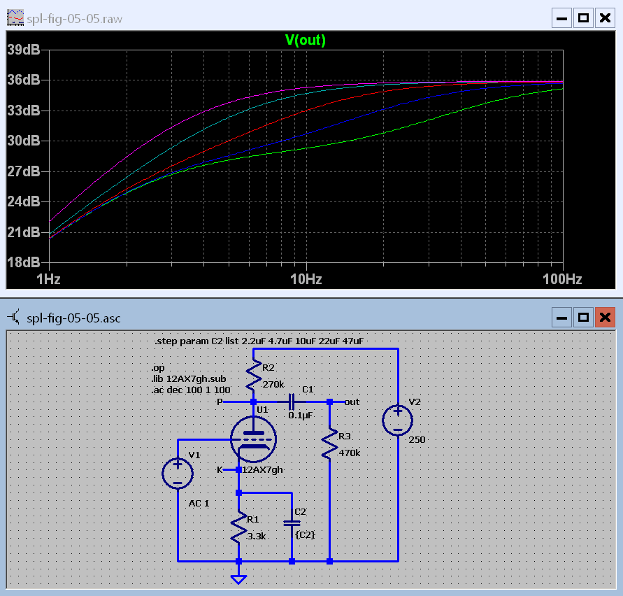 Figure 5.5 Results of Stepping the cathode bypass capacitor with C1 at 0.22 uf.