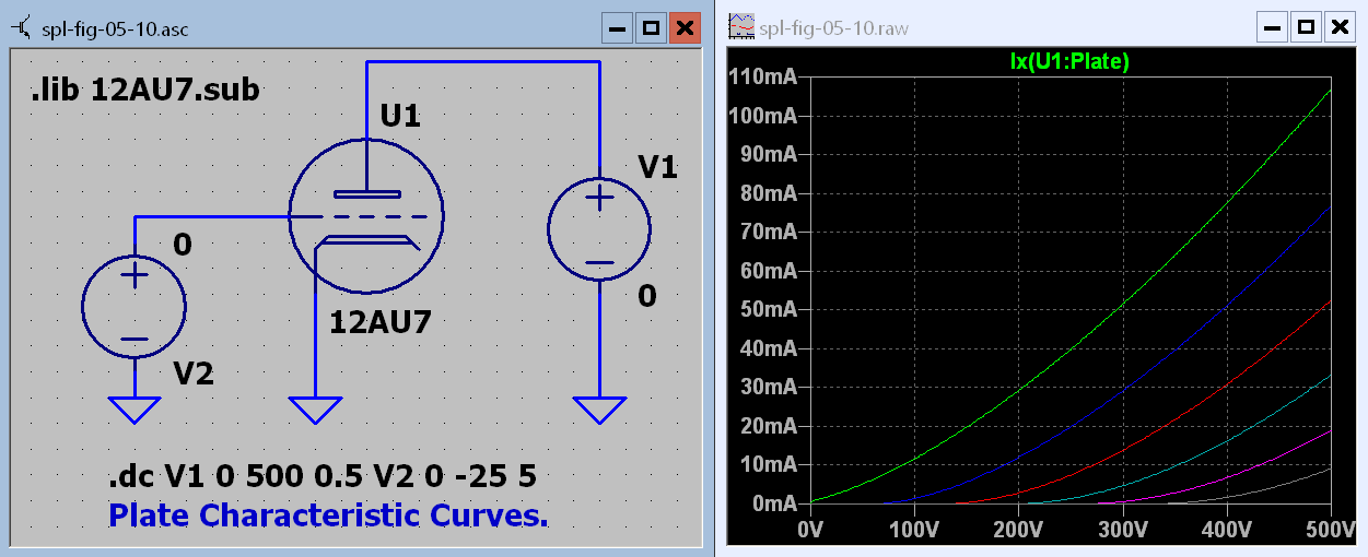 On the left is a generator, V2, 0 volts. The negative end of V2 is grounded while the positive end connects to the grid of a triode tube, XU1, a 12AU7. The cathode of XU1 is grounded. The plate connects to the positive of generator V1, 0 volts. The negative is grounded. A spice directive on the diagram reads ".lib 12AU7.sub". Another directive reads ".dc V1 0 500 50 V2 0 -25 5". A comment reads "Plate characteristic curves". End verbal description.So you think I must have screwed up by putting V2 on the left and V1 on the right. Wrong. If, when you write your netlist you decide to fix my mistake by reversing V1 and V2 you will find that it doesn't work as predicted. Leave it as described. Here is what spice does in response to the .dc directive. V2 is set to zero volts and held there while V1 steps from 0 to 500 volts. Then V2 is set to -5 volts and V1 is once again stepped from 0 to 500 volts. The value of V1 appears on the X axis of the visual graph and the user can select what is plotted on the Y axis. To get the desired curves the user must select the plate current of XU1. A sighted user will set up V1 to change in 0.5 volt steps which would generate a lot of printed data. We have chosen V1 steps of 50 volts to keep the amount of data within reason.