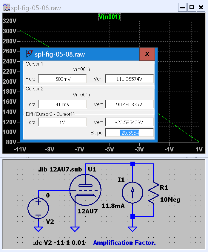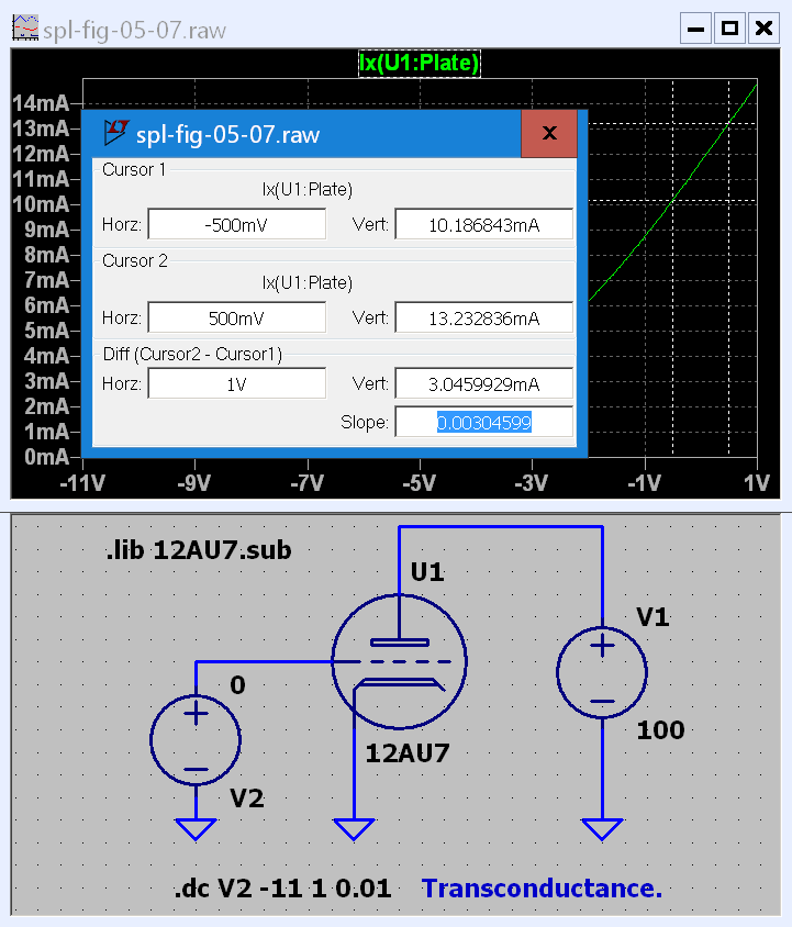 Vp = 250 V, Vg =-8.5 V, Gm = 2200 μmhos.V1 is set to 100 volts and the cursors are set at +0.5 volts and -0.5 volts to give a "change of grid voltage" that is symmetrical about zero. The transconductance IS the slope of the line. When the slope value is converted to micro mhos by moving the decimal point 6 places to the right it turns out to be 3046 µmhos. That's an error of -1.74%.