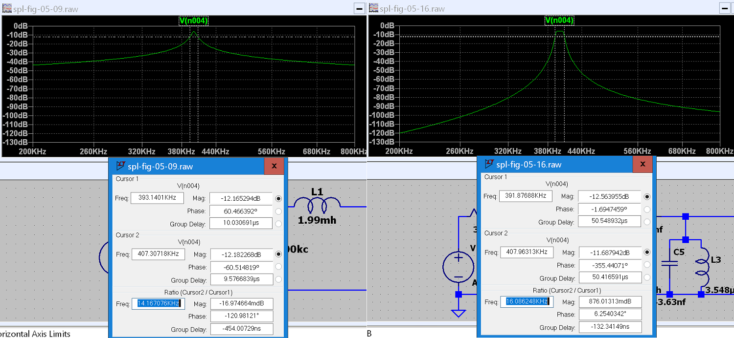 What say you now? The out of band attenuation of the single tuned circuit filter is revealed by the cursers to be -43.5 dB at both 200 and 800 kHz. The stop band is symmetrical but that's the only good thing that can be said about this filter. Although the readout box states "ratio" the frequency at the bottom is the difference not the ratio. This is good because we are given the bandwidth without having to reach for our calculators. It seems as if the folks at LT were a little careless with their labeling. We must admit that the wonderful job they have done in developing this tool means they can be forgiven for a few oversights. And the price is right too.