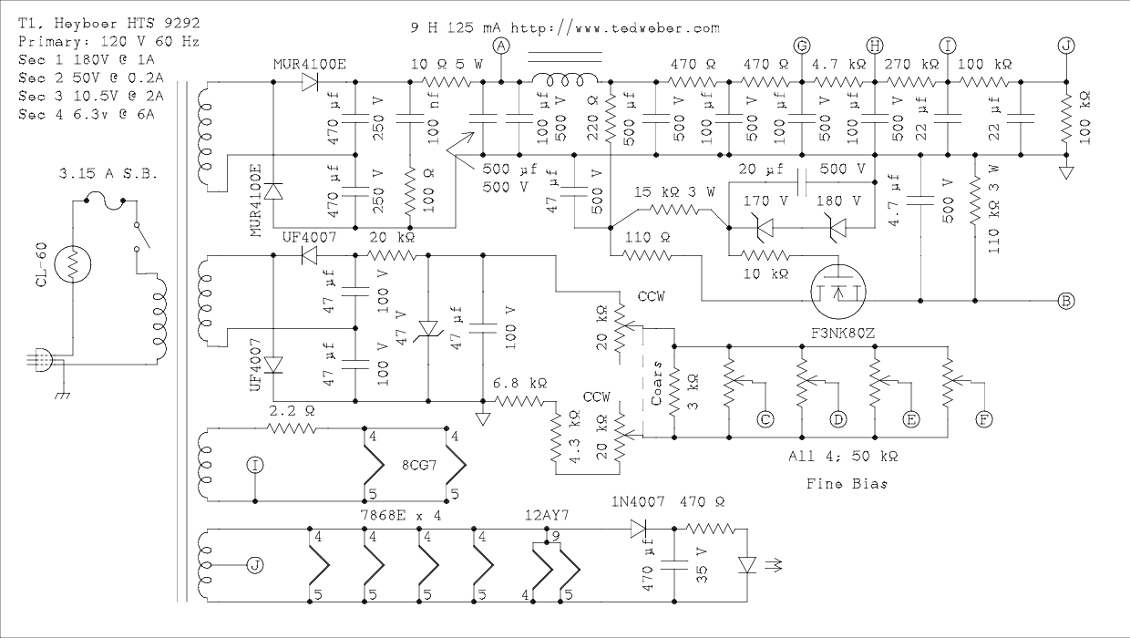 Tim uses only a 10 ohm resistor and 600 μf of filtering after the rectifier and before the center taps of the output transformers. He follows this with a π section C-L-C filter plus two L sections of RC filtering before powering the long tail pair and another RC section to filter for the 12AY7 plate circuit. Connections I and J serve to bias the heaters positively.