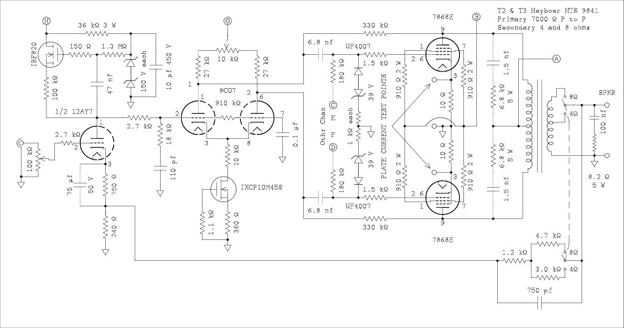 Next comes the long tail pair which is biased by the plate voltage of the 12AY7. Tim uses an 8CG7 which costs less than the much in demand 6CG7. He has to order an extra heater winding on the custom made power transformer that he prefers and I don't know how much extra this adds to the cost of the transformer. The long tail pair has a silicon based current sink in the cathodes which eliminates the need for different values of plate load resistors.