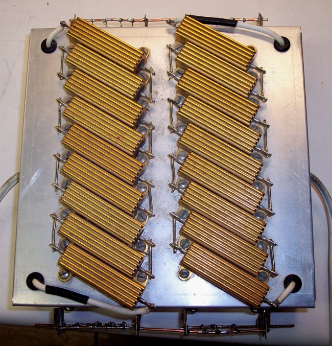 Note: This is not meant to be a how to article. Mostly because those resistors aren't plated with gold, they are solid unobtainium. The section on making precision resistors by successive approximation may be useful so I will walk you through an example.I made my load out of 0.909 ohm 1% 30 watt resistors, 9 in series for each resistor. That gives a calculated value of 8.181 ohms. That value is 2.2625% high. The calculated power is 270 watts. With them snuggled together like that I don't for a minute believe that I can expect them to dissipate that much power. These resistors are designed to be mounted on a chassis which provides a considerable heat sink. I estimate I can safely dissipate 50 watts on each side. I have dissipated 200 watts for short periods. Resistors of this type don't burn out instantly when overloaded. They get hotter and hotter until the high temperature finally destroys them.
