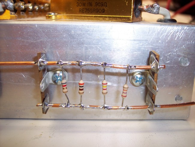 The picture below shows the end result of the procedure described. If you look carefully at the photo of the dummy load above you will see that there are two such assemblies on each side of the load chassis. In the photo below the 72.0 ohm resistor is on the left out of the picture. The two resistors are permanently connected in series.