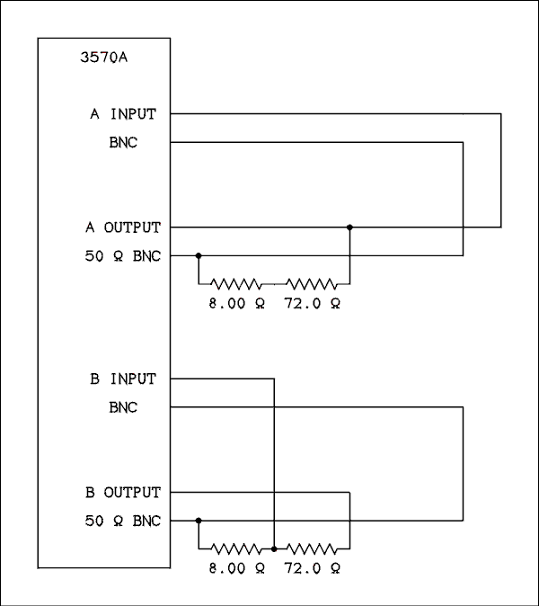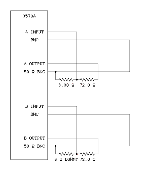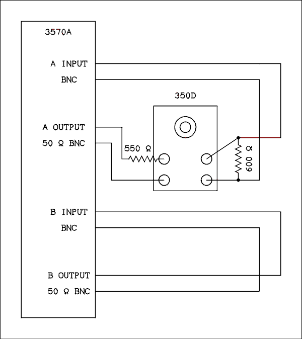 Testing the 3570A is a matter of connecting one channel output to the same channel input and connecting the attenuator between the other input and output. Initial level setting is determined by the output setting on the synthesizer. Lights on the front panel of the analyzer warn If the maximum input amplitude is exceeded. The attenuator is connected as shown in the figure below and the channel selector set to either A or B depending where the attenuator is connected. The analyzer instructions state that it is permissible for the output not to be terminated in 50 ohms as long as the frequency is not too high.
