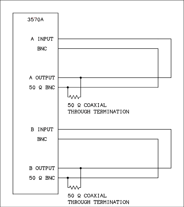 For this test each output was terminated with a 50 ohm coaxial pass through termination. Each output was connected to its input using equal length test leads, 4 BNC to alligator clips, clipped together.