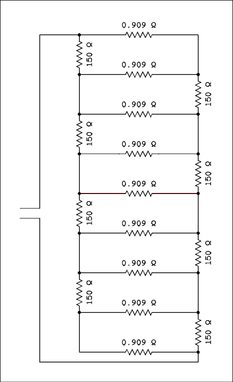 With the 5 amp current source driving the entire network the voltage across it was 40.043 volts. This gives a resistance of 8.0086 ohms. This is an error of 0.1075%. The voltage across each 0.909 ohm resistor is 4.491 volts for a dissipation of 22.2 watts. The voltage across each 150 ohm resistor is 8.928 volts for a dissipation of 0.531 watts.Allow me to point out that 200 watts is the power of my silicon amplifier and I have used the load at that power for short periods of time with a fan blowing across it. The highest power I am ever likely to apply from a tube amplifier is 100 watts which should be safe for all resistors.