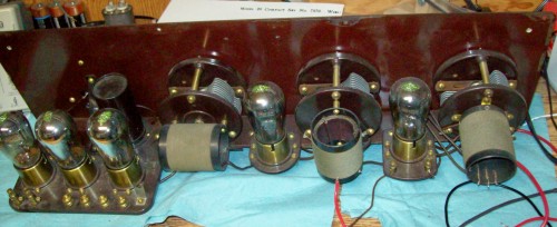 Oh yes, there's still that missing grid leak. I have been known to make some mistakes but I wouldn't have been so stupid as to throw it away. Someone familiar with the logo on the tubes might be able to recognize it in this picture.