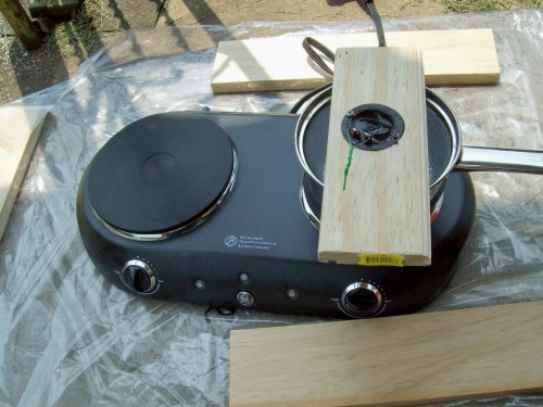 First step, melt the tar, how difficult can that be? I bought a hotplate and a saucepan, found a scrap of wood and drilled a big hole in it, and mounted the transformer in the hole.