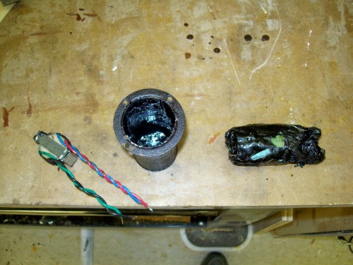 You can see the transformer mounted in the hole with two small woodscrews. You can also see the tar. The pan was filled with water which was brought to a boil. After two hours the tar had softened slightly but the transformer wouldn't come out. The melting temperature of the tar was above that of boiling water. Mice 1, man 0.