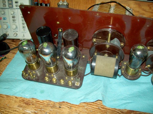 The set has 2 RF tubes, 1 detector tube and 2 audio amplifier tubes. They all have the number 201-A and look new. There is a logo on top of each one that I was not able to photograph. Some tests showed that the grid leak was open and there was no plate voltage on the first audio tube. All audio coupling is by transformers. The antique man probably thought the two round transformer cans were tubes. I soldered a 3.9 megohm resistor unobtrusively under the chassis across the grid leak holder and a 100 k ohm in the plate of the first audio tube to get some B+ there. I really can't explain why I did that, it is most illogical.