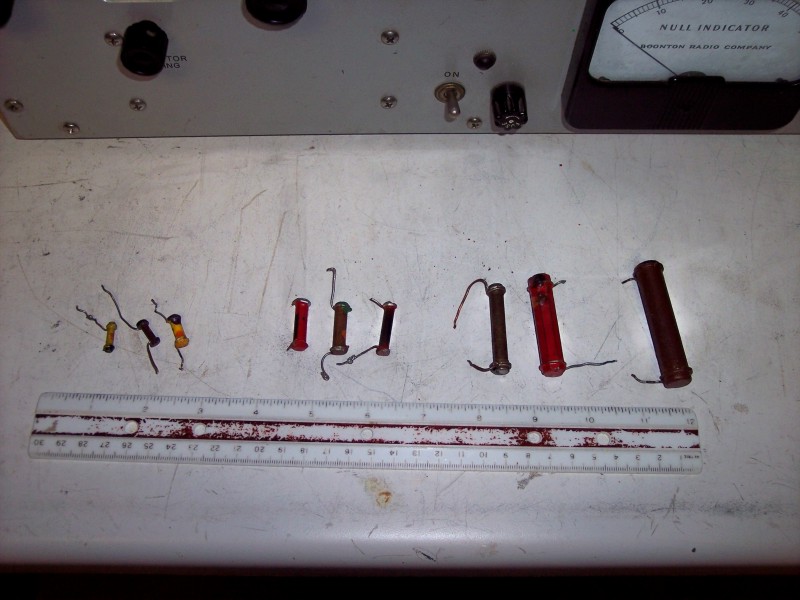 I had put out an appeal here for some dog bone resistors and I got some. As with the other resistor types I could not use any with a resistance greater than 100 k ohms. That left me with the 9 resistors you see in the picture above. I grouped them into small, medium, large, and extra large. According to my authority on these resistors the small are 1/4 watt, medium are 1/2 watt, large are 1 watt and extra large are 2 watt.