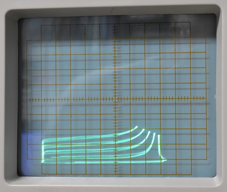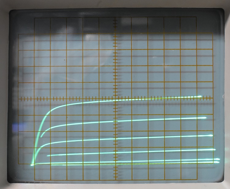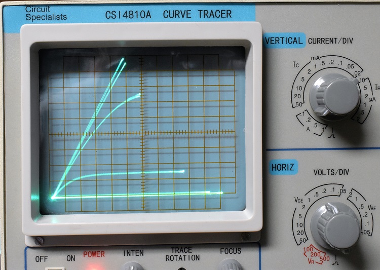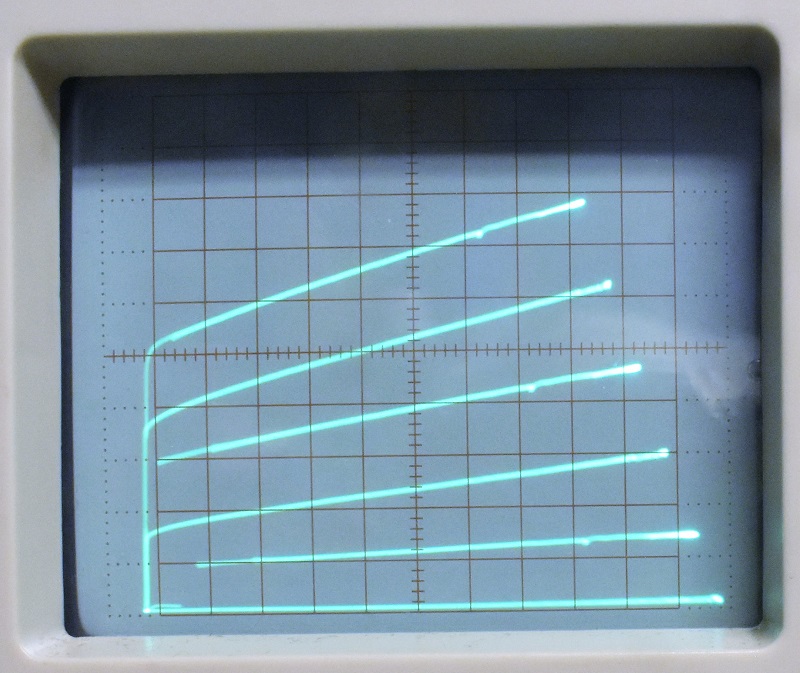 I don't wish to dwell on this but the tracer did need some warranty work. Circuit Specialists made good on it so I am happy. If you scroll down the page to the heading "Calculating Power Dissipation in the DUT" and look at the next three screen shots just below it you will see the screen of the first tracer I had. When it was returned after being repaired it was not the same unit. You can see in most of the other screen shots on this page photos of the one I currently havethat the graticule is etched on a transparent material which is in front of and outside the CRT. In some of the pictures you will see the one with the internal graticule and others with an external one. If you decide to buy one of these tracers I cannot say which kind you will get. I don't think the CRT was replaced. There didn't seem to be any reason for doing that.The CRT has a considerable amount of astigmatism. Enough to send you reaching for the astigmatism control if it had one. When I open up the scope I hope to find an internal control. If I am really lucky it will be placed so I can drill a hole in a side panel for screwdriver access to it.