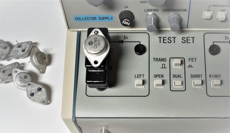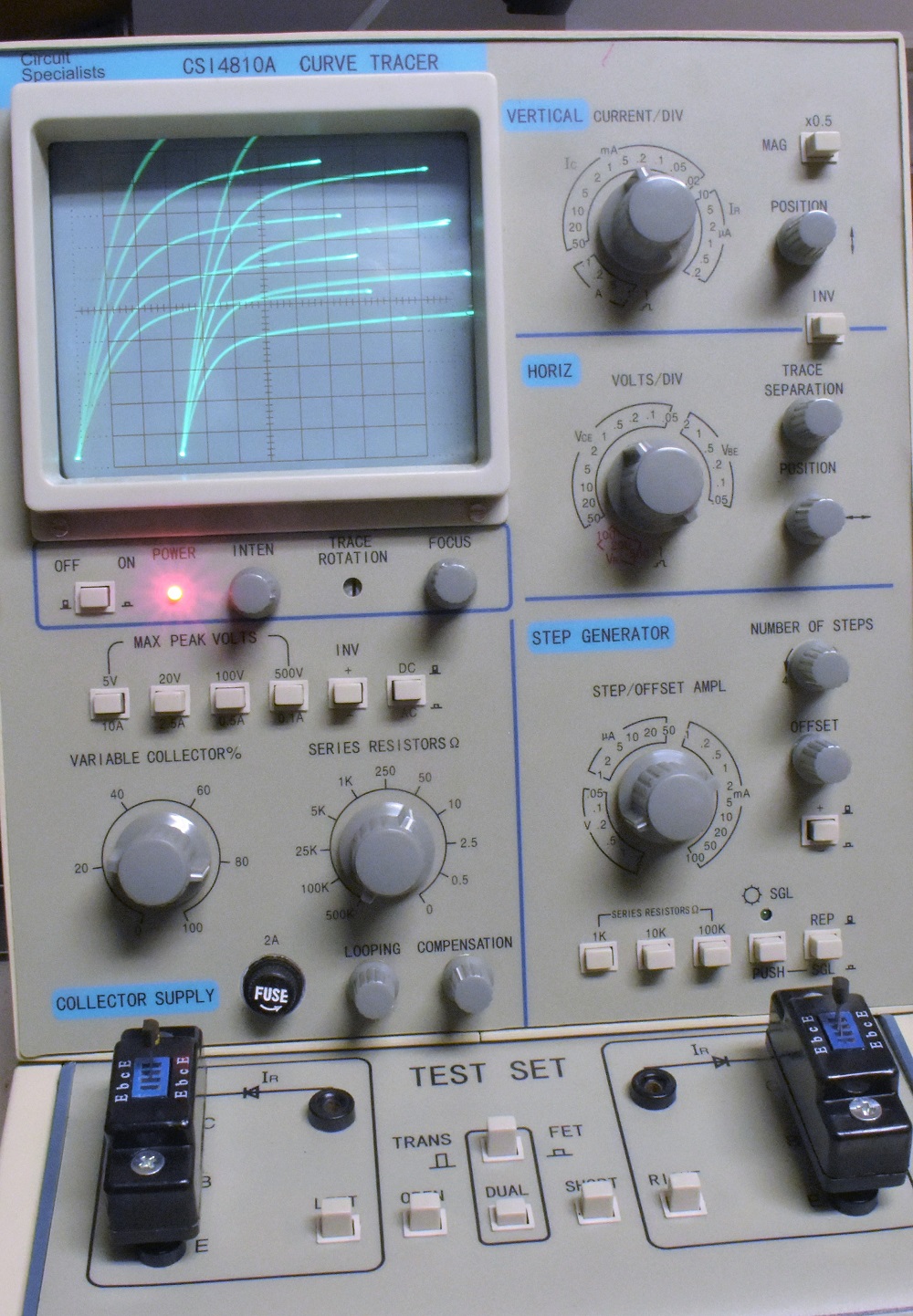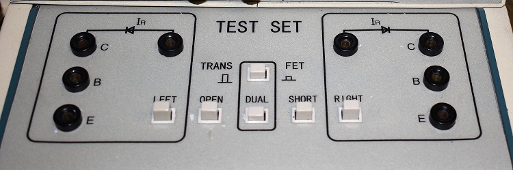 The TEST SET is where the transistor test fixtures are plugged into sets of banana jacks to connect the DUT to the testing circuitry. There are pushbutton controls to set the mode of operation and help with adjustment of the controls on the oscilloscope front panel.