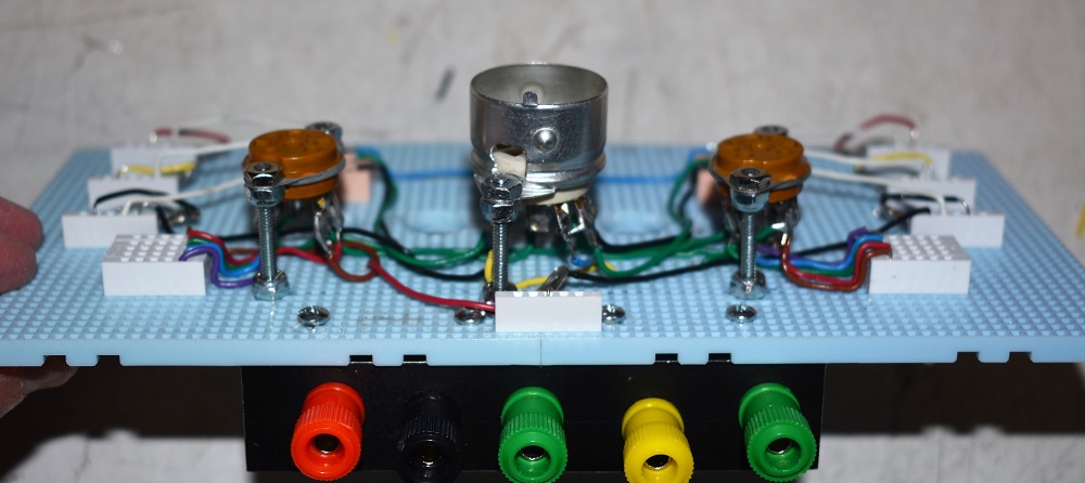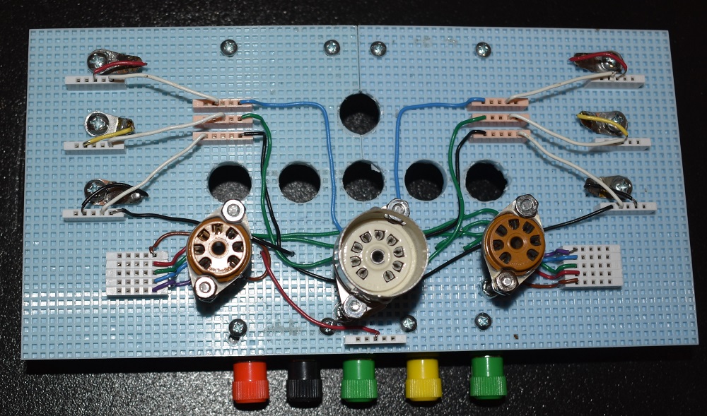 The color coding of wires from the dual triode socket is; Blue - Plate, Green - Grid, and Black - Cathode. Pin 9 comes out to the yellow jack on the front for parallel heater connection. I might change this later making it easier to trace a 9 pin tube other than a dual triode such as a triode - pentode. There's no law that says you have to exactly duplicate my version.