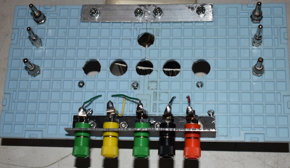 This is built using the 5E boards available from this website. These boards snap together. My first thought was to glue them but it seems that a glue that will really stick to plastic has yet to be invented. I was forced to use metal and screws as you can see in the pictures below.This fixture is made primarily to test dual triodes for matching. They are wired for the 12A_7 series but it appears that there was a defacto standard for dual triodes. Because there was some room left over I decided to add two 7 pin sockets for matching pairs of 6C4s. They could also be used to match pairs of any 7 pin tube including pentodes. This should be the only one of this size that I need to make.