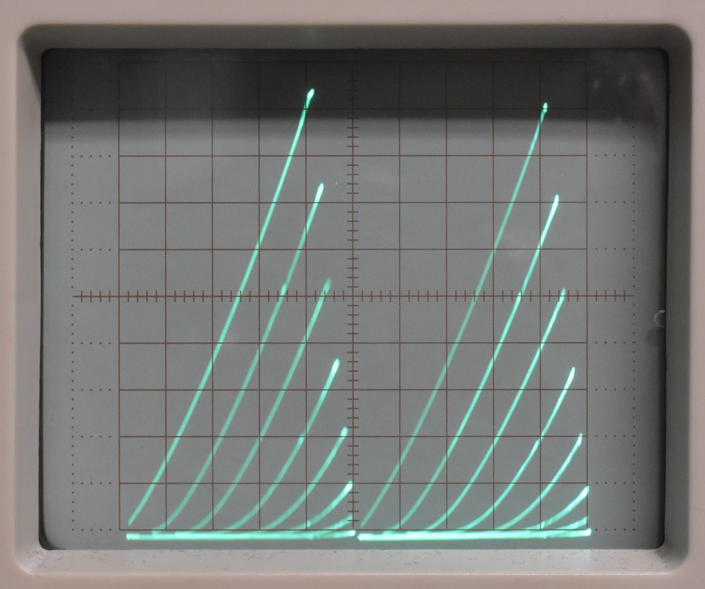 The photo below shows a pair of MPF102 FETs being compared. Finding exact matched pairs can be tedious but this curve tracer makes it a little easier. You still need a large number of devices and a generis helping of patients. The trace separation control can be used to move the two traces very close together but they won't move to the total overlap position. This may be due to a mistaken internal adjustment or a mistake on the part of the designers. To judge the most precise matching it would be necessary to have the two families of curves exactly overlaid.