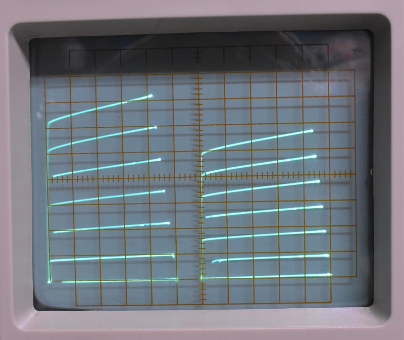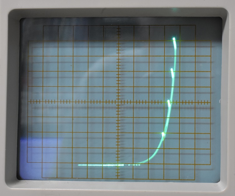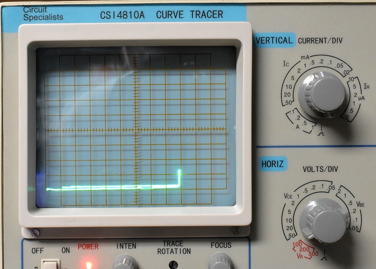 On the X (horizontal) axis it will display voltage between base and emitter, or gate and source, from 0.05 to 2 volts / div set in the familiar 1, 2, 5, sequence. By continuing to rotate the same control it will display voltage between collector and emitter, or drain and source, from 0.05 to 50 volts / div. There is an additional section labeled VR and printed in red. This goes from 100 to 500 volts / div. These highly dangerous voltages have not been enabled on this unit. I think this is a wise decision. Reverse or forward voltage can still be applied to a diode and measured using the VCE settings.On the Y (vertical) axis it will display reverse diode current from 0.2 to 10 micro amps. Continued rotation of the control will allow display of collector or drain current from 0.02 milli amps to 1 amp.