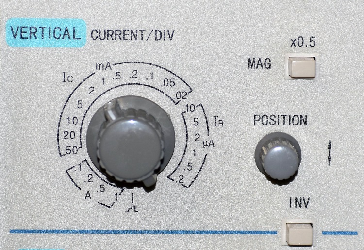 The CURRENT/DIV knob has 3 distinct areas. Starting at the fully clockwise position they are IR reverse current of a diode in microamps that is connected to the IR test jacks, IC collector current of a BJT or drain current of an FET in mA milliamps. And finally is IC in amps for some real power. The x0.5 pushbutton will double the size of the display in the vertical dimension.