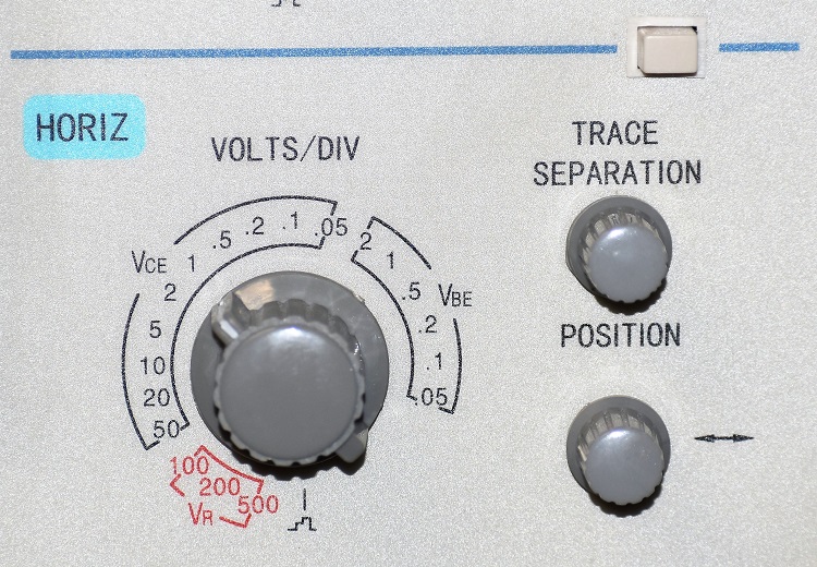 The VOLTS/DIV knob has 3 distinct areas. Starting at the fully clockwise position they are VBE base to emitter voltage on a BJT or gate to source voltage on an FET, VCE collector to emitter voltage on a BJT or drain to source voltage on an FET, and VR reverse voltage on a diode. The highest voltages, up to 5000 volts have not been implemented on this tracer. When the switch is rotated from 50 volts/div to 100 volts/div the voltage goes to zero. However the reverse characteristics of a diode can still be explored up to 500 volts.