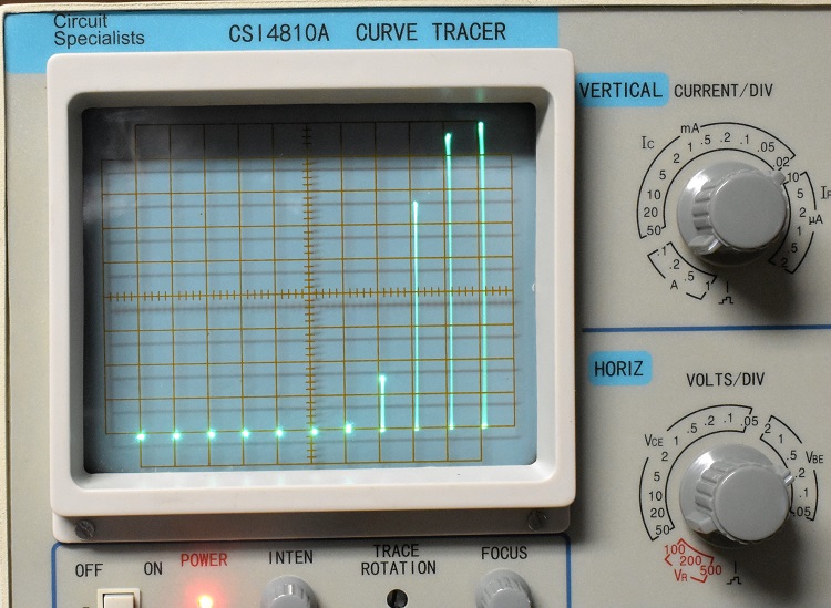 Connect the transistor and depress the correct left or right button. Advance the STEP/OFFSET AMPL clockwise until the display is as large as it can be without overflowing the screen. If you do not get any deflection the BJT is most likely bad.At this setting the transistor will become warm to the touch. If you want to increase the voltage to discover the secondary breakdown voltage, decrease the base current setting and increase the amount of SERIES RESISTANCE Ω to a very large value such as 100 kΩ.