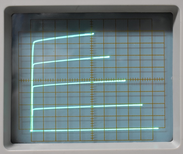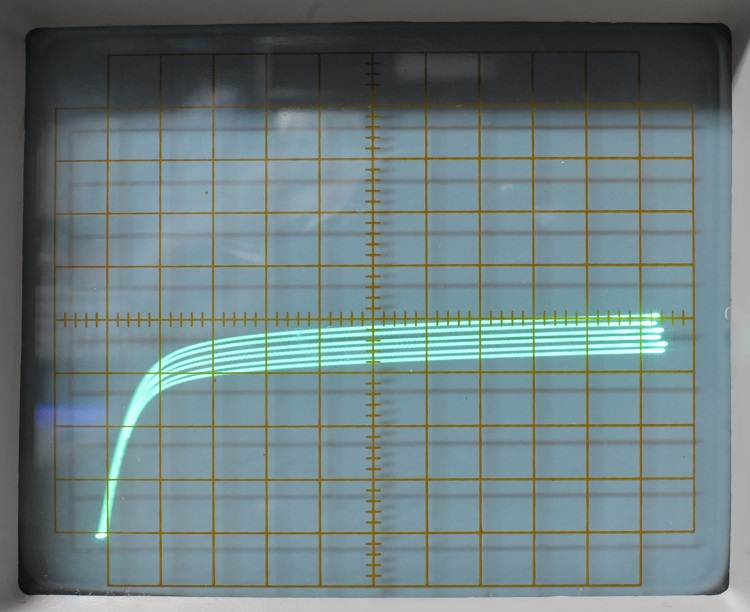 Rotate the Offset control in the STEP GENERATOR area of the control panel. Note that the entire family of curves moves up and down as you do so. Press and hold the SHORT button. This places a short between gate and source. Note that a single trace appears. Release the button. Because you just disturbed it the top trace of the family probably is not in the same place as the single trace. Repeatedly press and release the SHORT button while adjusting the OFFSET control until the top trace is in exactly the same place as the single trace that appears when the button is pressed.You should now see something like this.