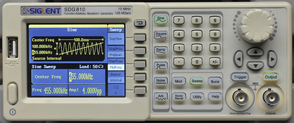 The times 10 probes that go with any modern oscilloscope have low capacitance but it is still enough to detune an IF transformer. After you make all of the connections the alignment must be retouched a bit. Don't forget to ground the shield can of the transformer. Turn off the sweep function and set the generator to 455 kHz. Carefully adjust both tuning adjustments for maximum deflection on the scope. Adjust the two alternately to be sure to account for any interaction between the two adjustments.I have collected several function generators, I suppose for situations like this. I will now go through them giving detailed setup instructions and showing the results. Some cost more than others. I will start with the least expensive and work up to the most. The generators are,