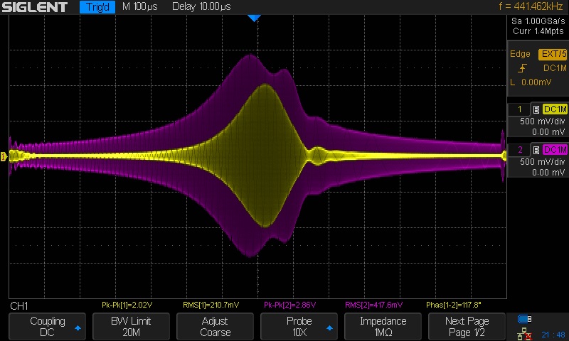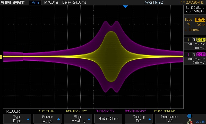 The consequence of this is that the screen has no absolute calibration. If you pre tuned the transformer to 455kHz as described above you can have some confidence that the peak of the response is very close to 455 kHz. The relative calibration of 10 kHz per division is called into question by the need to set the frequency of the synchronizing wave on channel 2 to 0.96 Hz. This does not give me high confidence in the relative calibration either. The extra 4% might be accounted for as retrace time in an analog generator, a digital frequency generator should not require very much time to reset to the starting frequency. The scope picture below puts an end to all of this speculation.