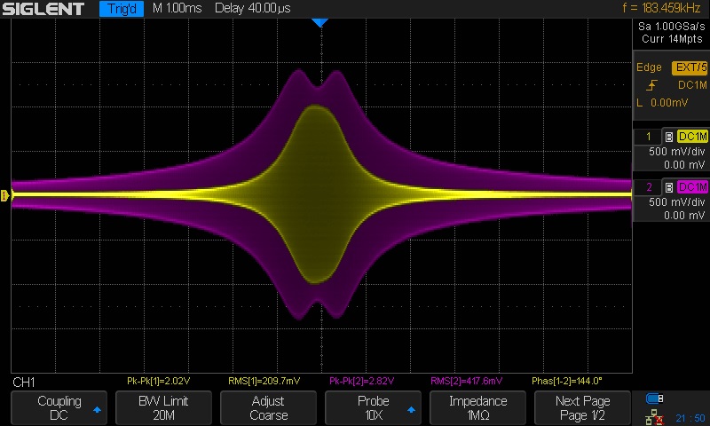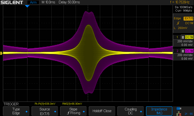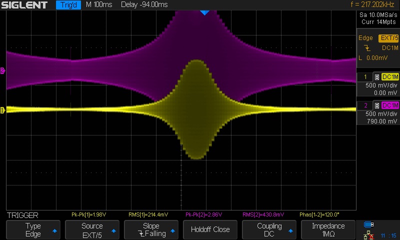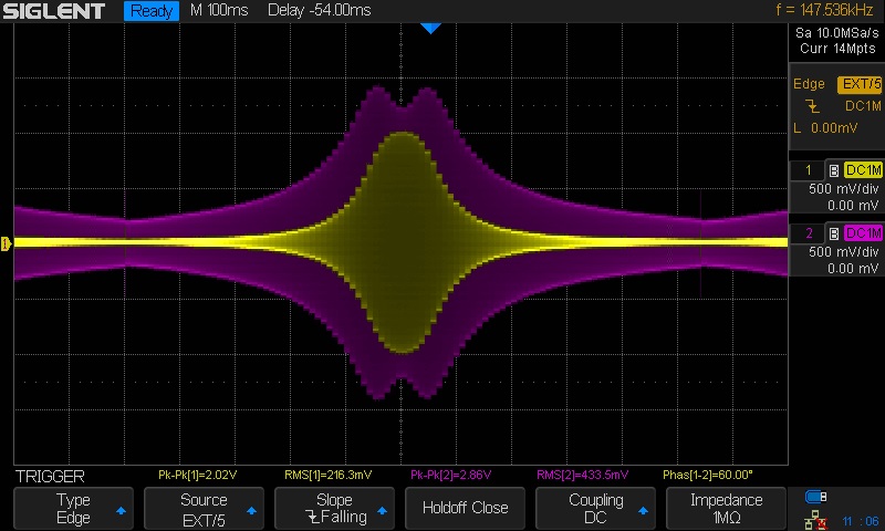 - Set the sweep time to either 100 ms, 140 ms or whatever suits your scope and your fancy.