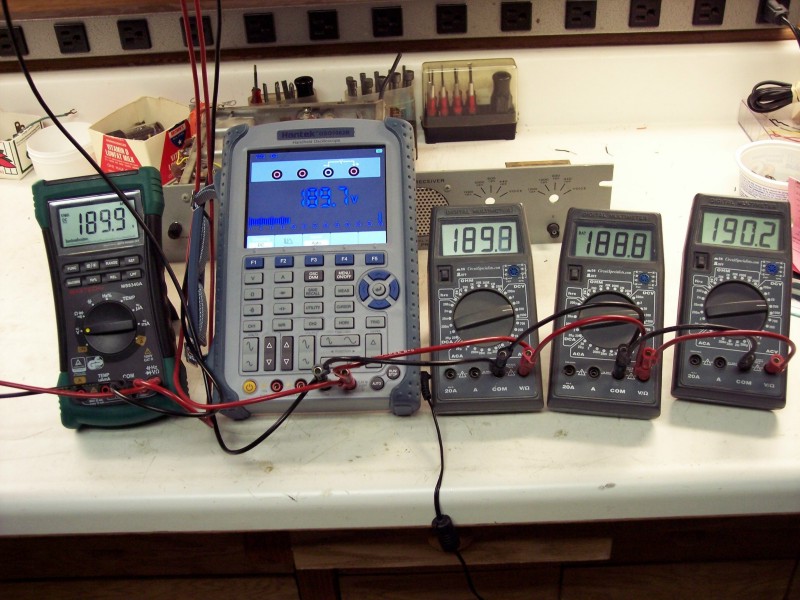 The MS8340A is off by only 0.05% which is much better than its specifications. Maybe the spects are pessimistic or maybe I lucked out and got a good one. Either way, I'll take it. Meanwhile the DSO/DMM is off by 0.16% and two of the knockabouts are within +/-0.1%. Even the worst of the three is only off by 0.63% which is almost an order of magnitude better than the average analog meter and still 3.3 times better than the best of the analog meters. Note: I am taking an average analog meter as having an accuracy spec of ±5% and the best as having a spec of ±2%.