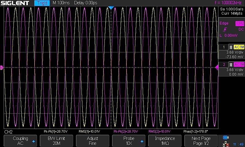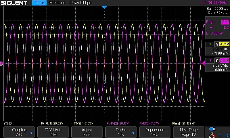 The breadboard should say that the level at both outputs is down by 3 dB at the corner frequency of the resistor and capacitor. The two signals remain 180 degrees out of phase and equal in amplitude as far down as I checked which is 1 Hz. The frequency where the output was down by 3dB was 180 Hz which is a little off from the calculated value. Coming down from 5 kHz I found that the output was down by 0.1 dB at 900 Hz and 1 dB at 350 Hz. This makes the LTP count as one low frequency roll off. Because of the effect of grid current on the operating point of the tube I don't recommend going any higher than 1 MΩ for the grid resistor. A 1 μf cap will bring the corner frequency down to 0.159 Hz. This may be necessary if you are having trouble with low frequency instability or an infrasonic peak.