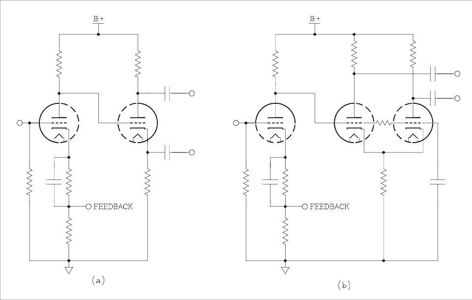 Figure 1a is often found with a coupling capacitor between the plate of the first tube and the grid of the second. In this case other means are provided for biasing the second tube. Also the first tube may be a pentode instead of a triode. This gives increased gain at the cost of increased complication and distortion. Also the plate load of the first tube may be some kind of constant current source or bootstrapped resistor. It is assumed that this improves linearity and therefor decreases distortion. It also increases gain but it also increases complexity. Because the gain of the SLPI is slightly less than unity all of the gain in the circuit has to come from the first tube. If this amplifier stage can't be coaxed into producing enough gain, another gain stage is added after the SLPI as in the Williamson circuit.