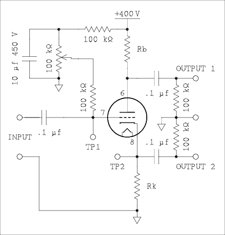 Split Load Phase Inverter, Ebb = 400 volts.Tube Rk & Rb Vk for Min %D @Vo