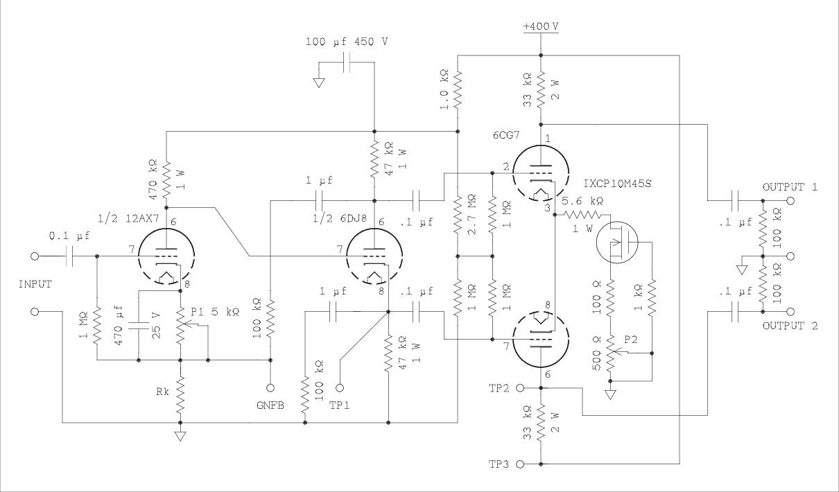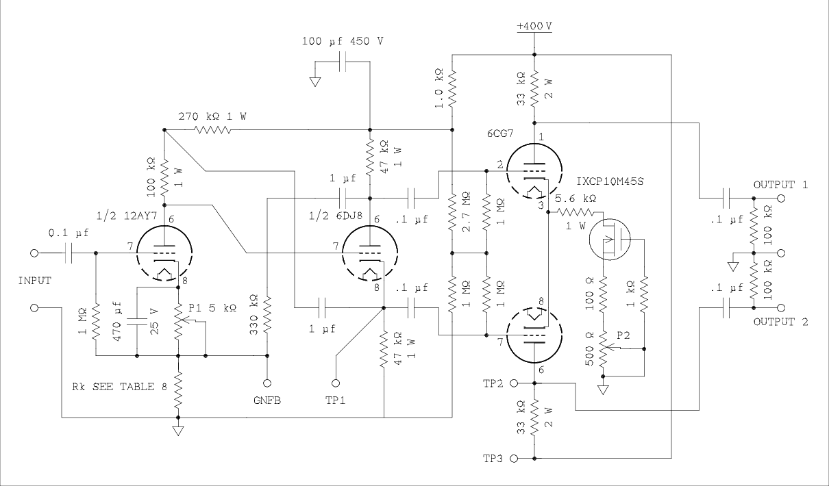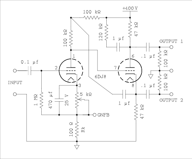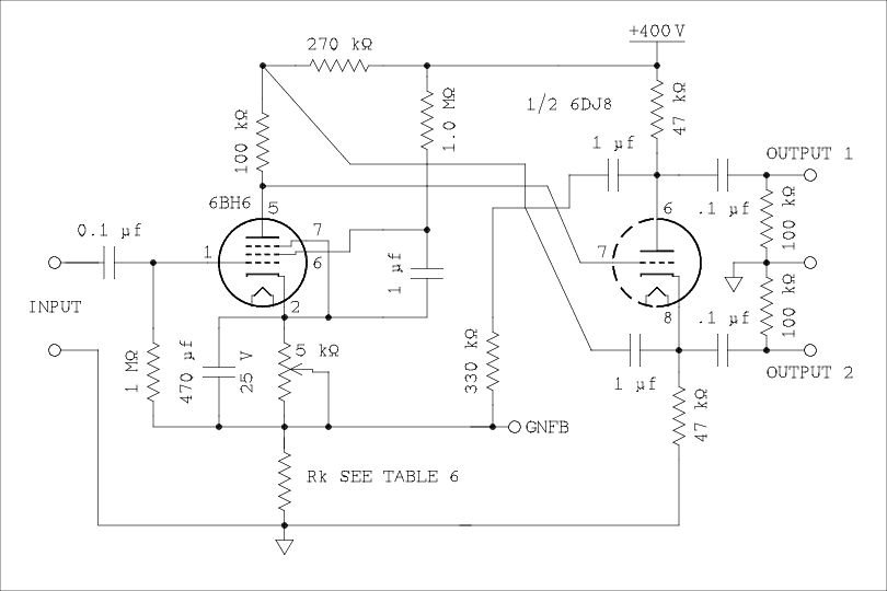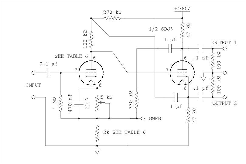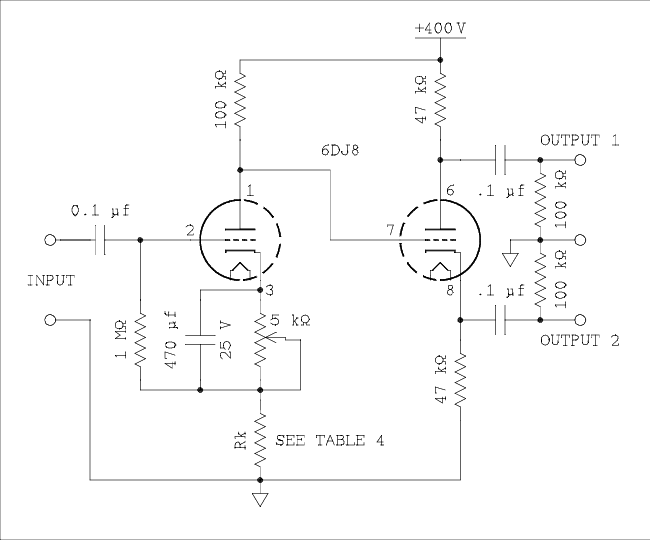 My plan on this was to use a different tube as the preinverter amplifier and design an amplifier using only one 6DJ8, one section in each channel. It doesn't seem likely that one tube type can achieve all possible gain values in table 3. But I know there is someone out there, and probably several someones, who will want to use the other section of the 6DJ8 as the preinverter amplifier and use two of these expensive tubes, one in each channel. I can't keep you from your folly so I will try to help you.6DJ8 with cathode degeneration.