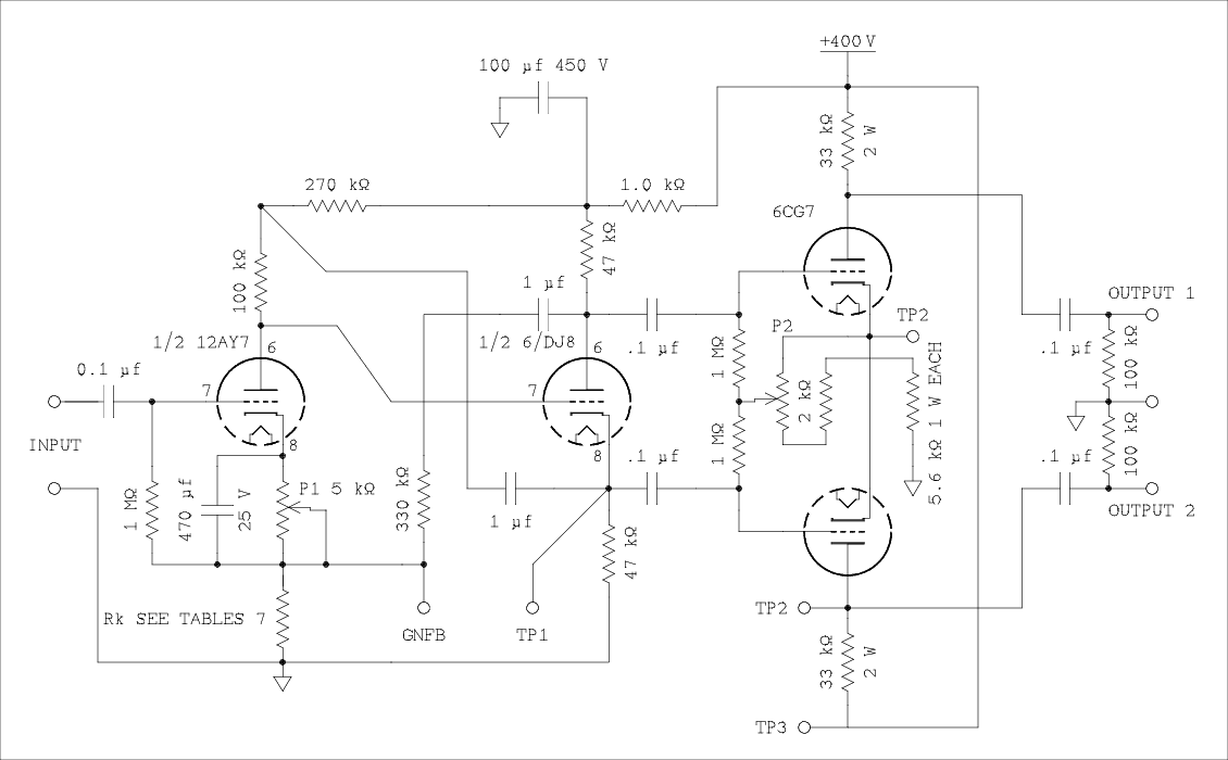 GainGNFB (dB) 6V6GT 14 10.6 10 0 6L6/G/GT 26.5 15.9 17 6550 EBB=400V 55 17 6550 EBB=600V 100 23 25 6L6GC 55 24.7 EL34 54 25 EL34 UL 34 25 6V6GT 14 10.6 33 10 6L6/G/GT 26.5 15.9 50 6550 EBB=400V 55 17 6550 EBB=600V 100 23 75 6L6GC 55 24.7 EL34 54 25 EL34 UL 34 25 6V6GT 14 10.6 106 20 6L6/G/GT 26.5 15.9 165 6550 EBB=400V 55 17 6550 EBB=600V 100 23 240 6L6GC 55 24.7 EL34 54 25 EL34 UL 34 25 In case you are wondering about my supply of 6DJ8s and their cost I stocked up on them several years ago before their price became totally insane as it is now. I doubt if I will buy anymore. I have enough to build more than one amplifier and have spares that should last for as long as I expect to live.