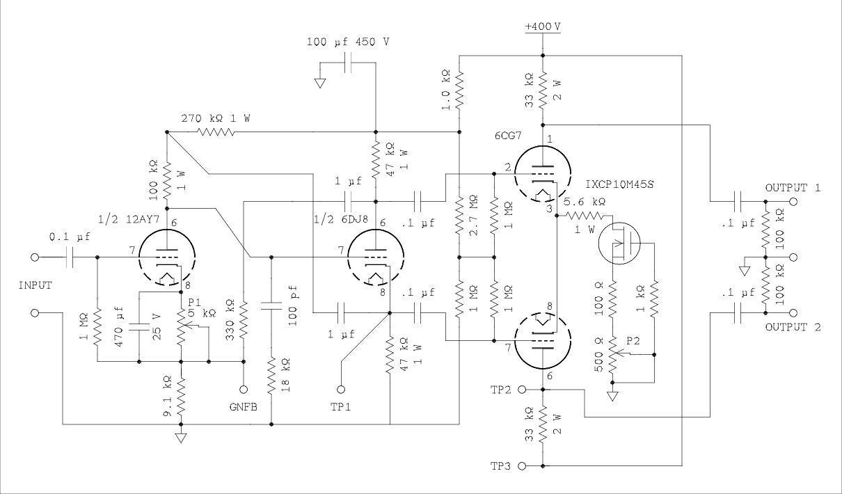 Plate 1/Plate 26DJ8 15 kΩ 100/100/106/115 0.932 ~0.139/0.1040 ~0.06390/0.06391 ~0.06010/0.06011 ~0.06157/0.06157 22 kΩ 100/100/113/112 0.9338 0.1038/01040 ~0.06365/0.06367 ~0.05878/0.05879 ~0.06096/0.06096 12AV7 15 kΩ 90/114/112/107 0.919 ~0.1038/0.1040 ~0.1171/0.1171 ~0.1671/0.1671 ~0.2448/0.2448 22 kΩ 100/113/112/111 0.921 0.1048/0.1050 0.1047/0.1047 0.1432/0.1432 0.2079/0.2079 Well, there's no point in belaboring the problem with spice. The tube models aren't good enough to accurately predict distortion. I think they do much better with gain. I'll test that out below on the amplifier section of the inverter.