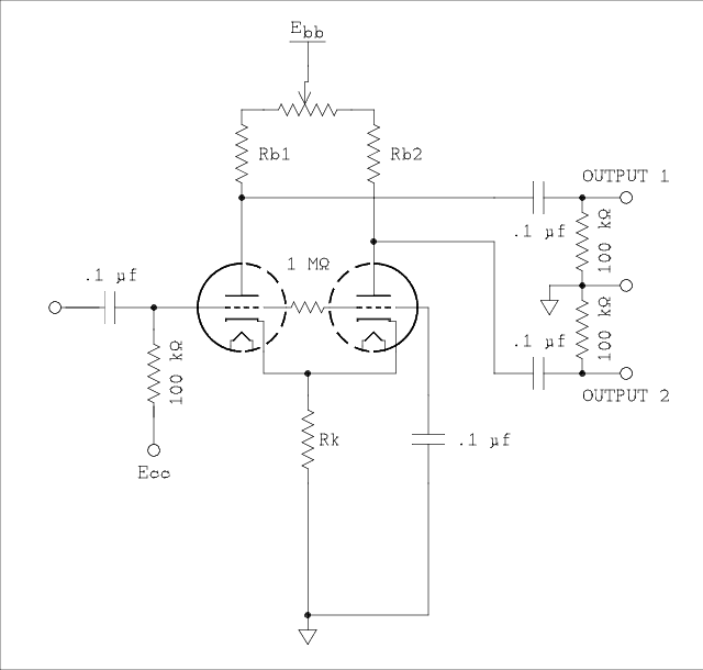 Something that always bothered me about the SLPI is that one of the signals is taken from the cathode and the other from the plate. There is a large impedance difference between these two points.Note; You can see the derivation of the impedance and gain equations at Pentode/Triode. There is a slight difference in notation between that page and this. Here I am using the notation used in resistance coupled amplifier charts which is also the notation used by electrical engineers.RO1 = Rb( rp + Rk(μ + 1)) / (Rb + rp + Rk(μ + 1)) RO2 = (Rk(rp + Rb)) / ((μ + 1)(rp + Rb + Rk))