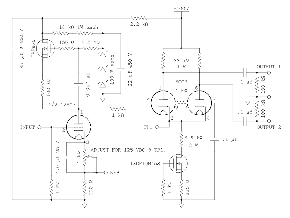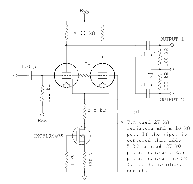 So are we splitting hairs instead of loads? Maybe but the big advantage of the current sink is perfect balance. When I set up the 6CG7 with a 15 k ohm resistor in the cathodes the starting values for the two plate loads were 33 k ohm and 39 k ohm. There was a bit of an imbalance and I corrected it by paralleling a 1.5 meg ohm with the 39 k ohm. This was determined experimentally. With the current sink the two resistors are of equal values and no tuning was necessary. It may seem to be a small improvement of distortion but distortion is like money. A little bit here and a little bit there adds up.