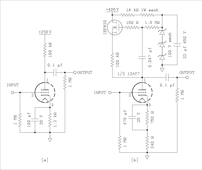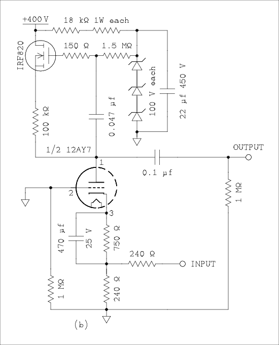Tim used a 12AY7 with bootstrapping as the amplifier stage before the long tail pair analyzed above, figure 17b. The MOSFET is a source follower which makes the upper end of the load resistor track the lower end. Tim informed me that he had used components he had on hand. I was forced into the same situation which accounts for the different values I used in the circuit. For example two 18 k ohm 1 W resistors to take the place of a 36 k ohm 3 watt.