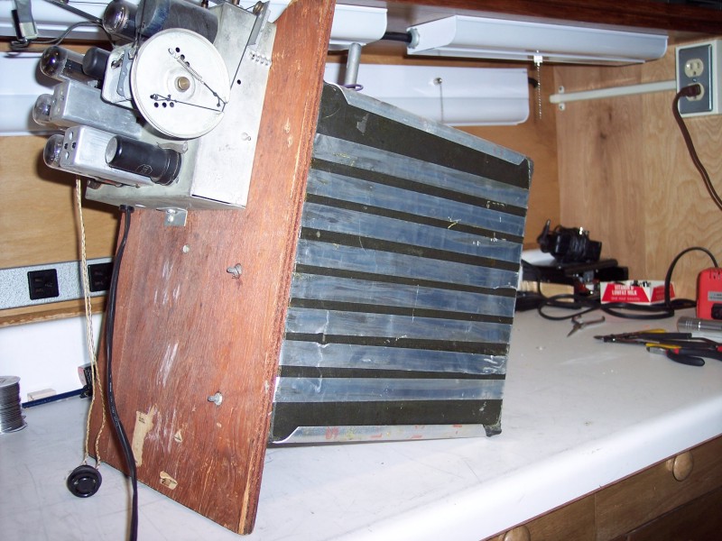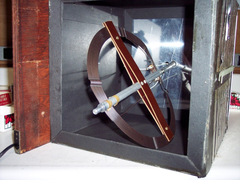 I had already guessed that the big knob controlled a rotating loop antenna and I was right but there turned out to be more to it than that. The loop is electrostaticly shielded. To allow the magnetic field to penetrate the box and induce a current in the loop there must not be a complete current path around the box. If there were it would be like a shorted turn in a transformer and there would be little signal induced in the loop. The horizontal strips of aluminum foil are broken on one side of the box. The bar in the bottom picture ties the top and bottom aluminum sheets together but it does not contact the foil strips.