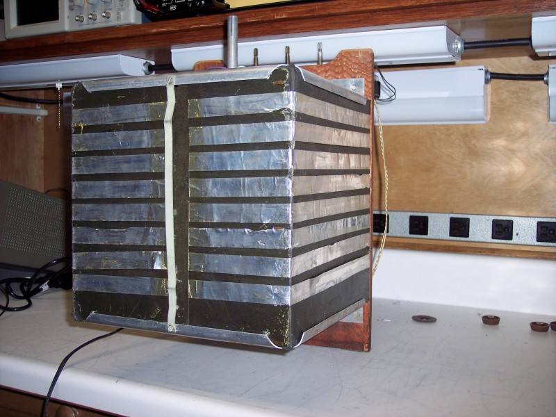 The box is made of an insulating material that is a very dark gray on the outside but inside the box it is a much lighter gray. It appears to be a heavy gauge version of Fish Paper. In the picture it could be taken for sheet aluminum but it is not.