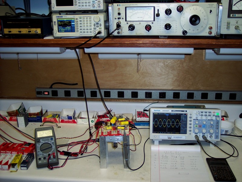 Going back to the original circuit the other three 7199s I own did not measure up to the first one I tried. The worst one measured 4% THD at 25 volts and about 1.3% at 17 volts. The gain and bandwidth were essentially the same for all 4 tubes. The 7199 is unique in its pinout so I will have to rewire the breadboard before trying anymore tubes. Oh, by the way, here is what the breadboard looks like.