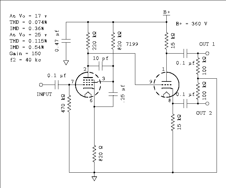 Both the original circuit and the variation employing a 7199 tube will be analyzed followed by substitution of several pentode-triode tube types. It needs to be noted that the 7199s that are in my possession are in white boxes marked "SOVT". They all have a defect. If AC is used to warm the heater and the heater transformer secondary is at ground potential there is considerable coupling between the heater and the cathode of the pentode. The induced AC is 20 dB below typical output level. If the heater supply is raised to 20 or more DC volts above ground the coupled signal is reduced to 60 dB below typical output. This in my opinion is not sufficient for use in a quality amplifier. For these tests I am operating the heater from DC. I knew that old transistor power supply would come in handy someday. The 7199 was supposedly designed to have minimum coupling between heaters and cathodes. Apparently SOVT didn't get the memo.