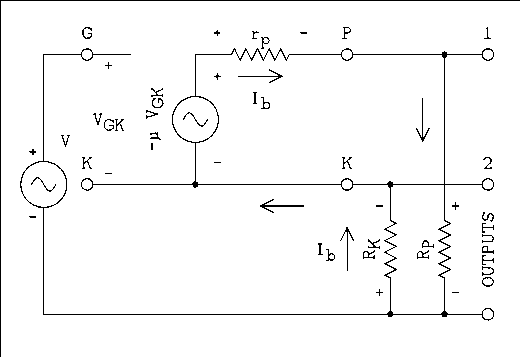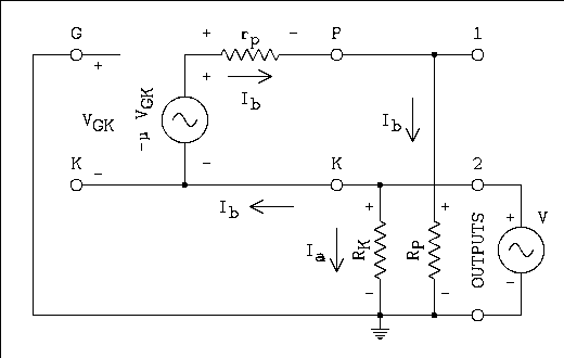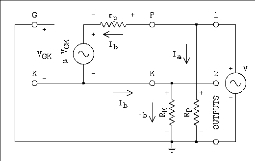 A2 = VO2 / V = μRK / (rp + RP + RK(μ + 1)) (11b) And to refresh everyone's memory, VO1 is the voltage at output 1, VO2 is the voltage at output 2, V is the input generator voltage which is also the voltage applied to the grid of the triode, μ is the amplification factor, rp is the plate resistance, RP is the physical resistor connected to the plate, and RK is the physical resistor connected to the cathode. Where a voltage at a point is referenced to circuit common.